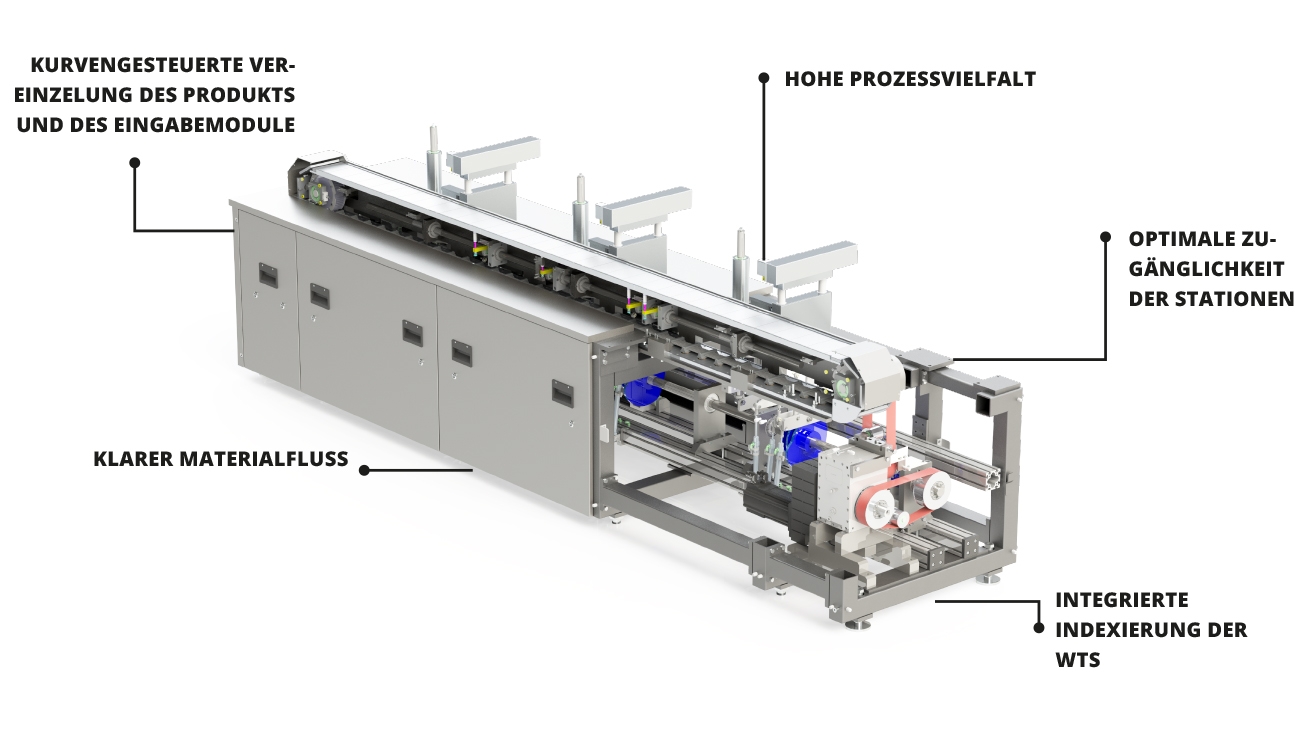 Der IKS Längstaktautomat ist eine Montagemaschine für komplexe Bauteile. Es können bis zu 30 Einzelteile montiert werden. Die Maschine zeichnet sich durch eine hohe Wiederholgenauigkeit und gute Zugänglichkeit aus.