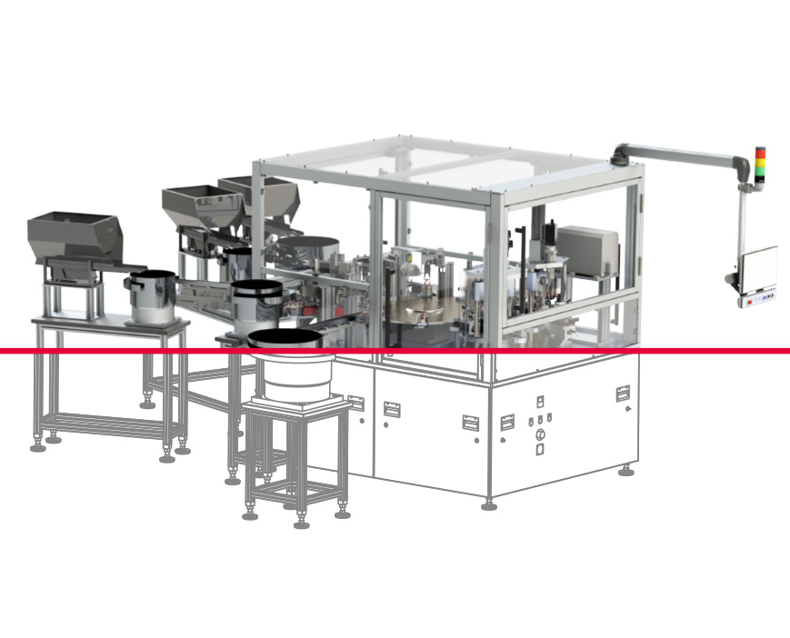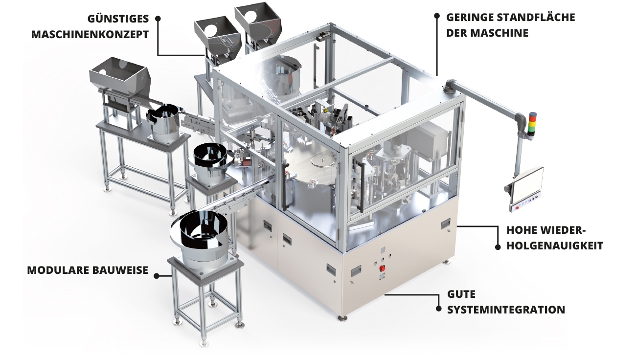 Eine Montagemaschine für mittlere Stückzahlen. Es können bis zu 16 Einzelteile montiert werden. Nicht rotationssymmetrische Produkte können montiert werden.